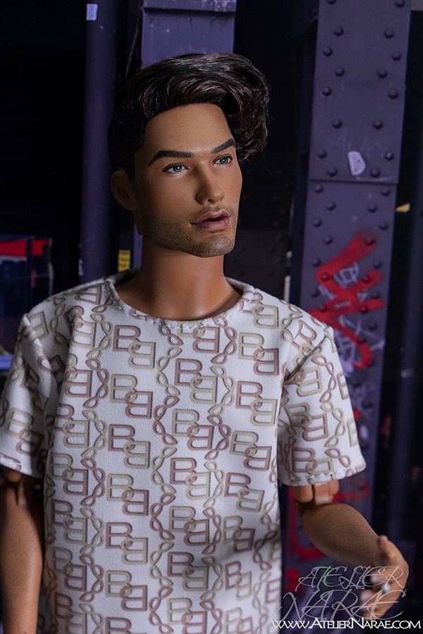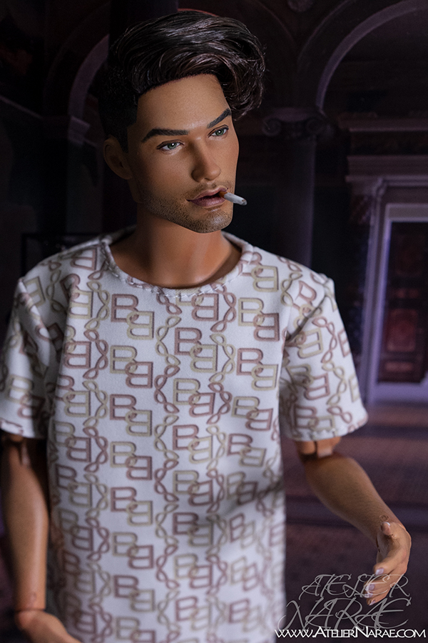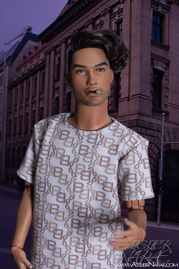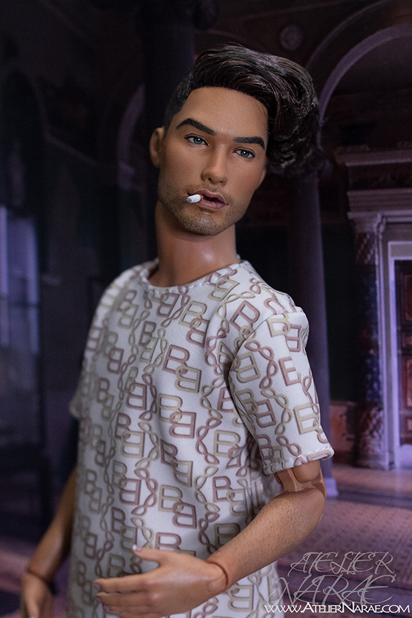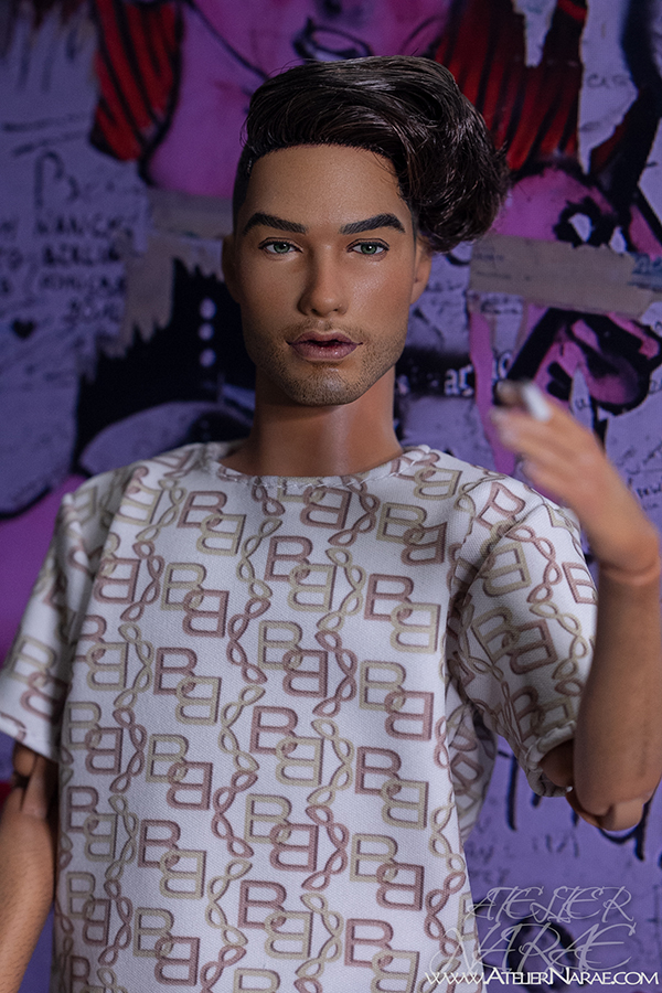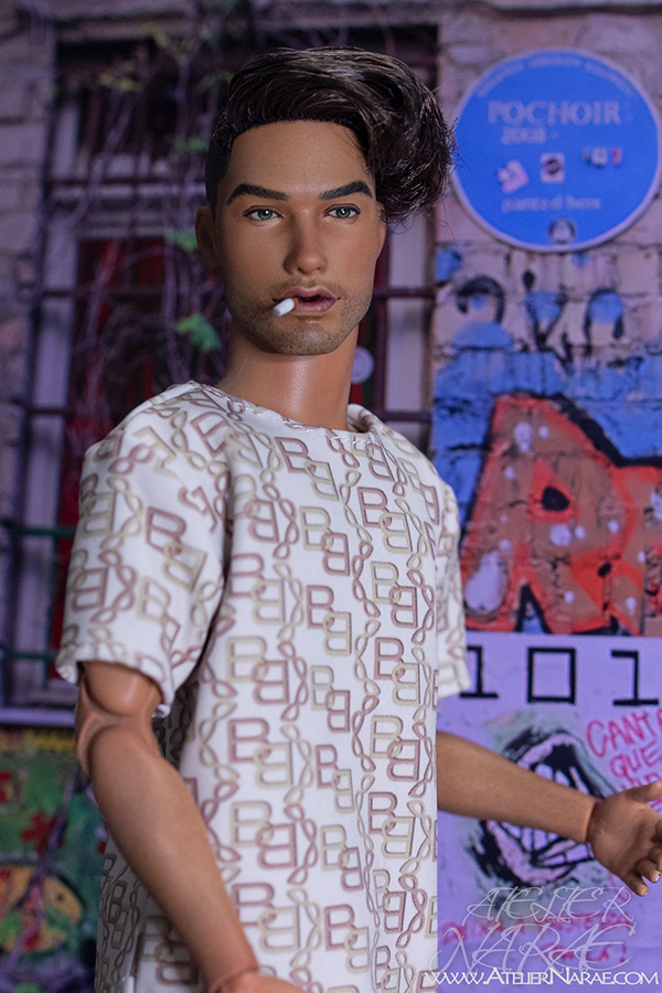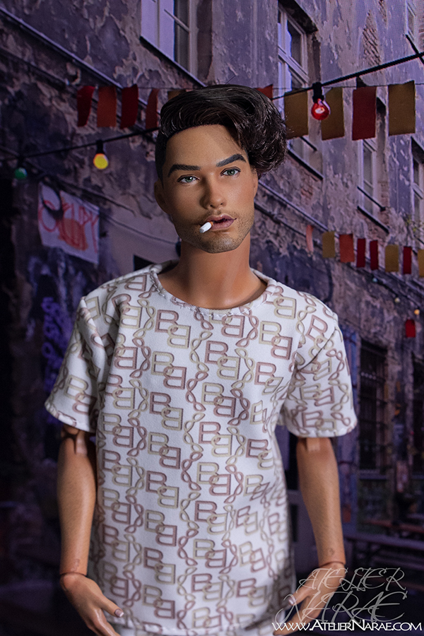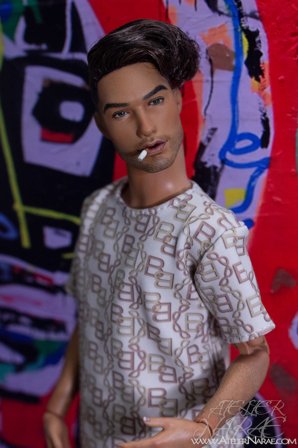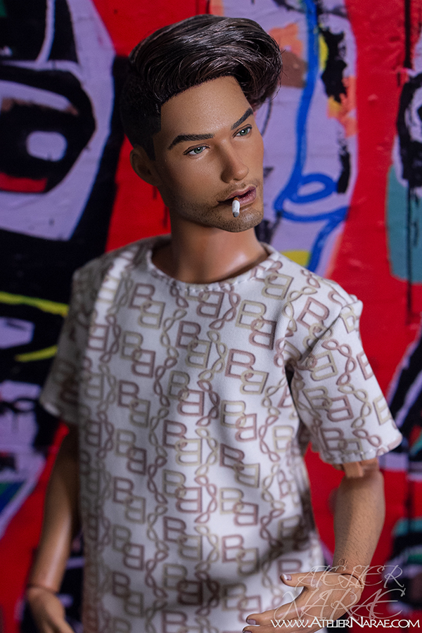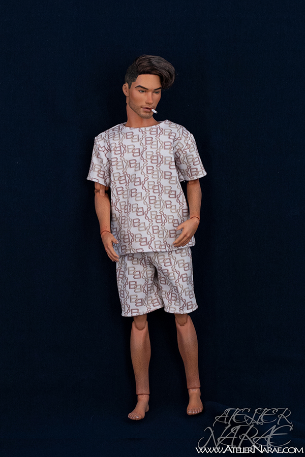 He will come dressed as shown in the photos:  t-shirt and shorts with matching chain-inspired print, along with a removable cigarette. His lips have been sculpted specifically for this special addition.